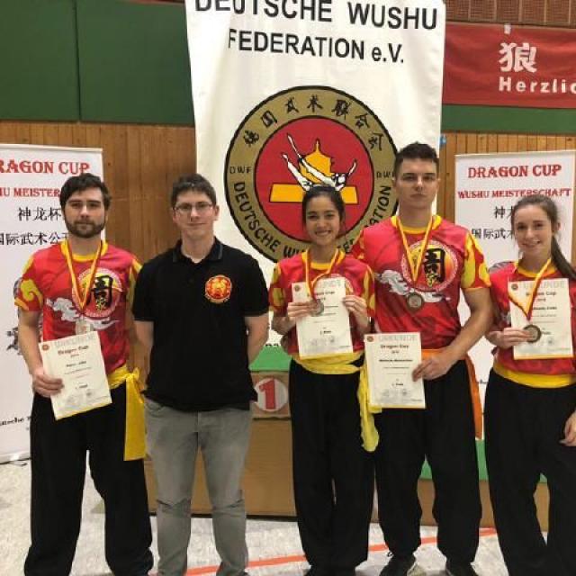 Gleich auf zwei Meisterschaften starteten die Athleten des Kung-Fu Zentrum Siegen und Burbach am 01.12.2018. Team 1 fuhr nach Wolfsburg zum Open International Dragon Cup, das von der Deutschen Wushu Ferderation (DWF) veranstaltet wurde. Hier konnten bei den Herren Handformen John Peter mit einem 2.Platz und Maximillian Wolleck mit einem 3. Platz glänzen. Aber auch die Athletinnen des Kung-Fu Zentrum erwischten einen guten Tag. Bei den Frauen Handformen konnten Vivienne Weißkirch und Cindy Kaufmann jeweils mit sehr guten Leistungen einen 2.Platz und einen 3.Platz erreichen. Cindy Kaufmann sicherte sich einen weiteren Titel und holte einen 2.Platz mit dem Säbel in der Kategorie traditionelle Kurzwaffen.